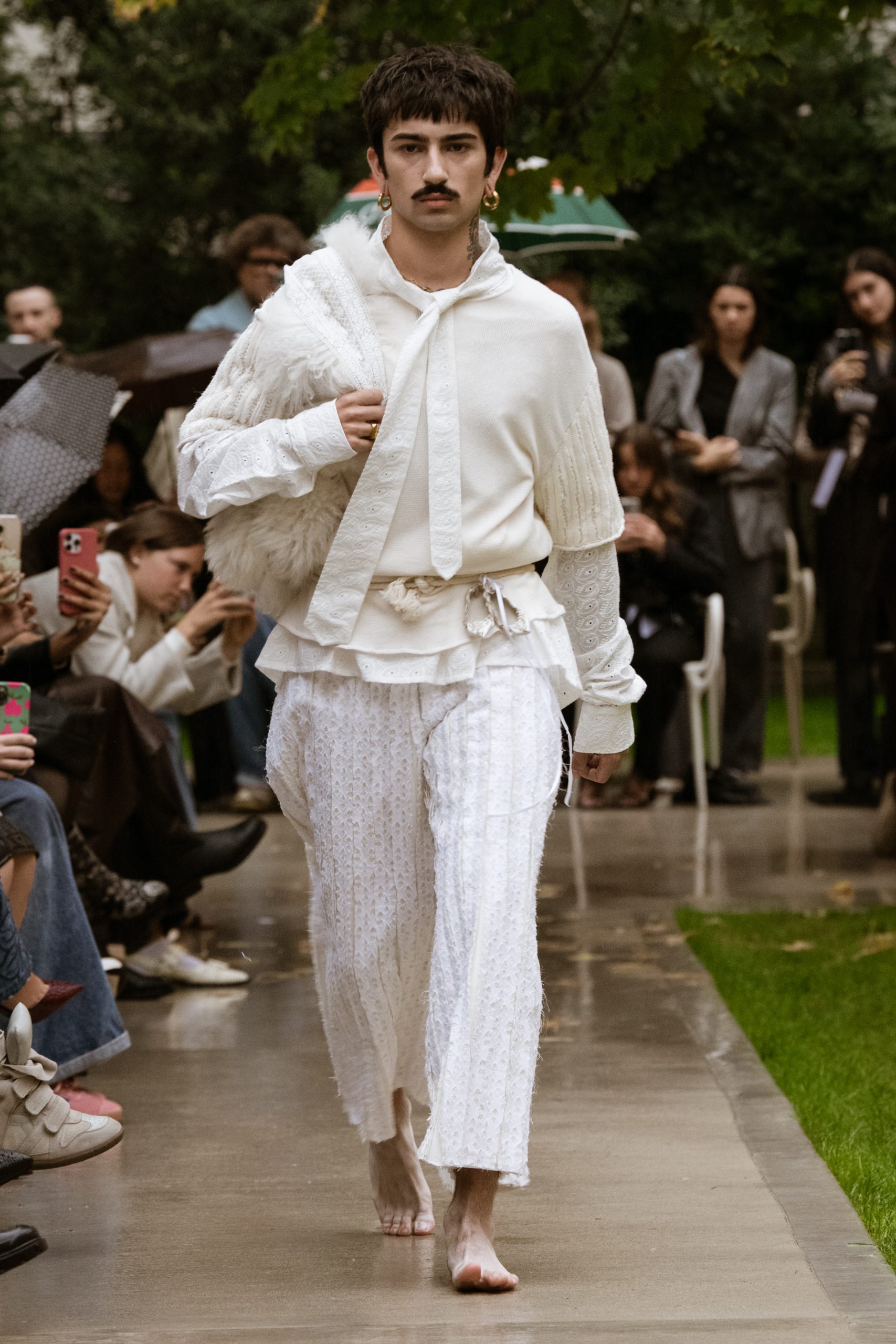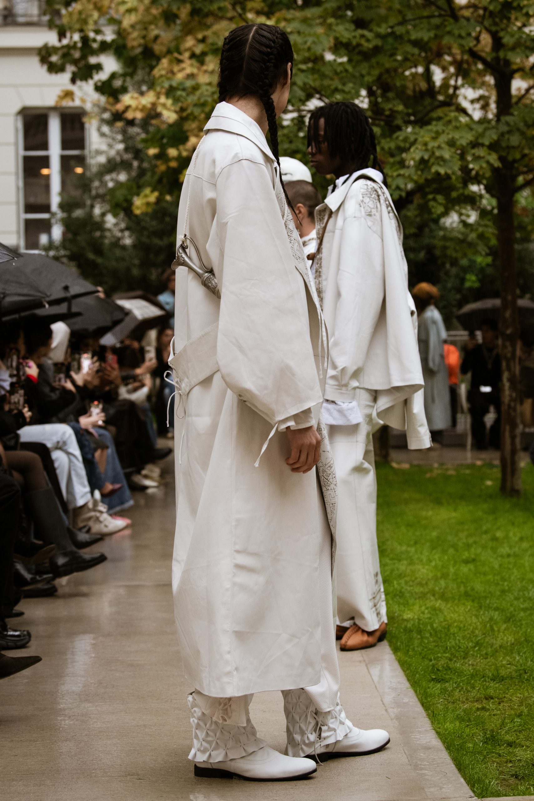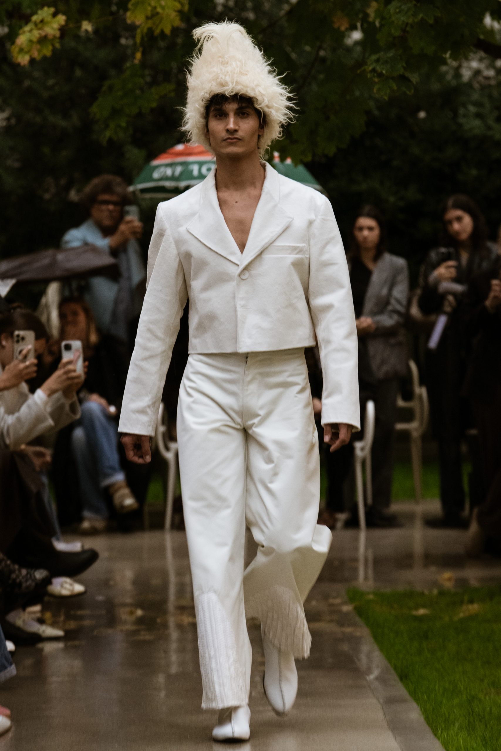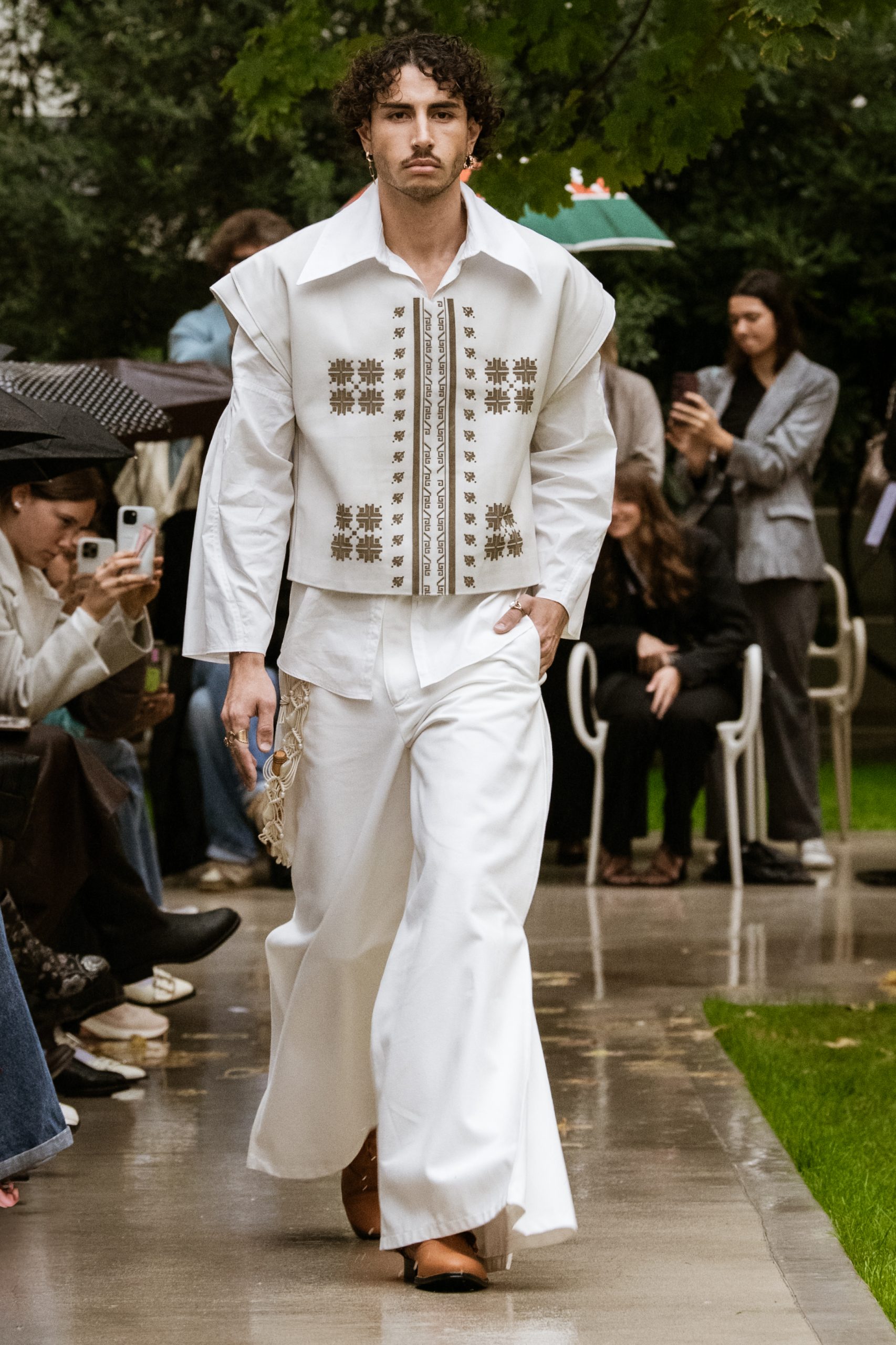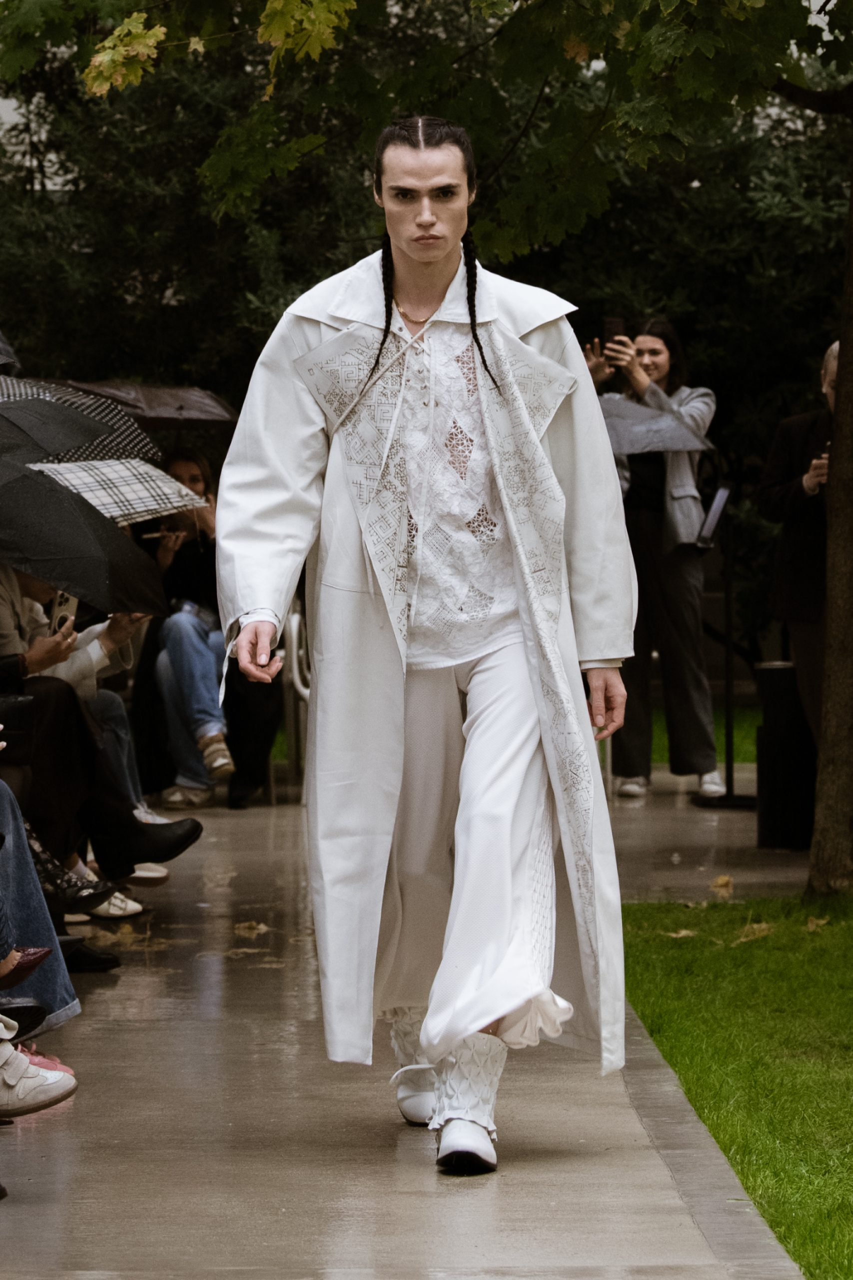 At the center of the collection lies dor, the untranslatable Romanian word for a deep, bittersweet longing. This sentiment shapes the tailoring: coats and jackets with open lapels, shirts marked by engraved details, and silhouettes that alternate between precision and looseness. Materials such as wool, linen, leather, and natural hair are handled with both restraint and disruption, creating contrasts between softness and rigidity, tradition and reinterpretation.