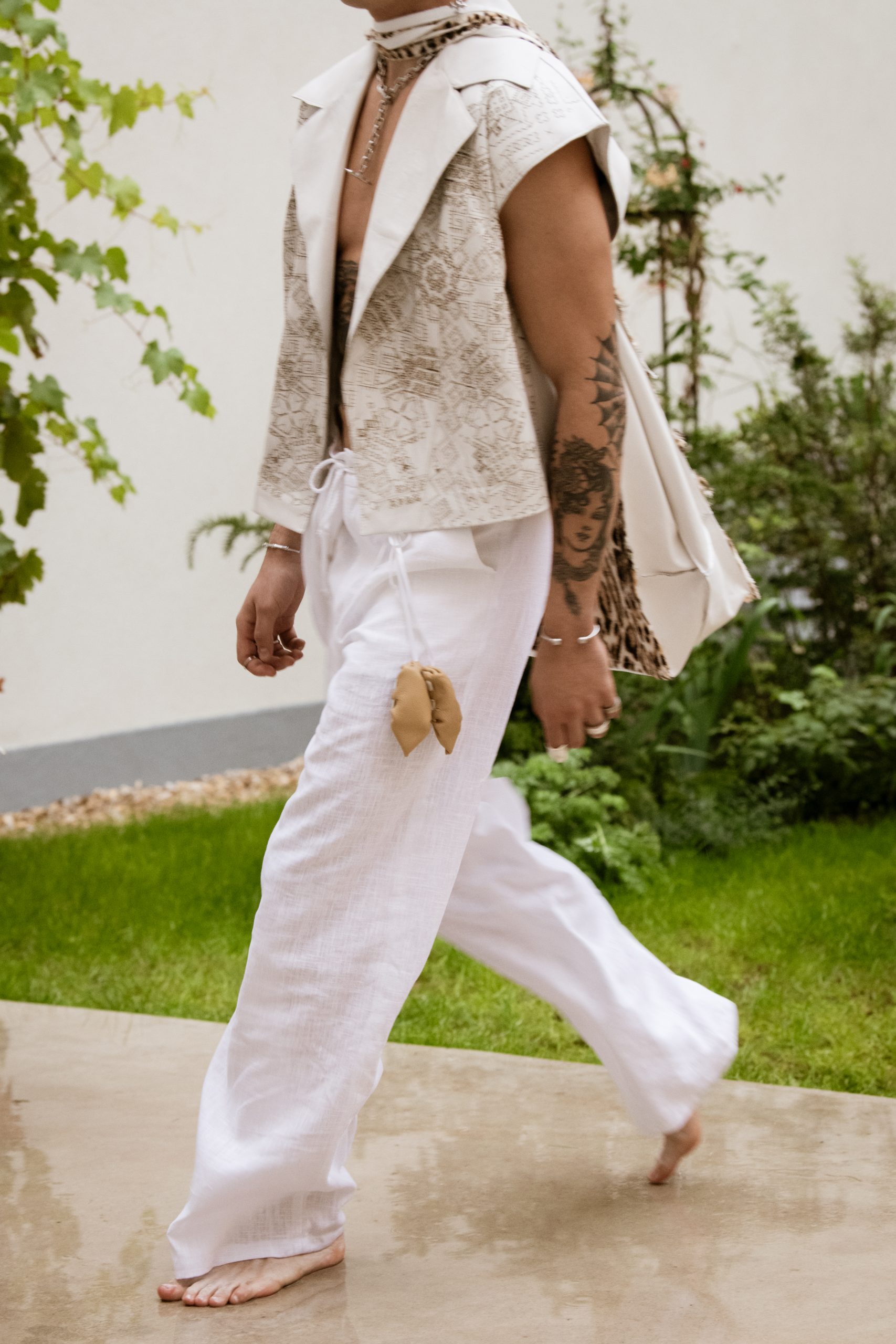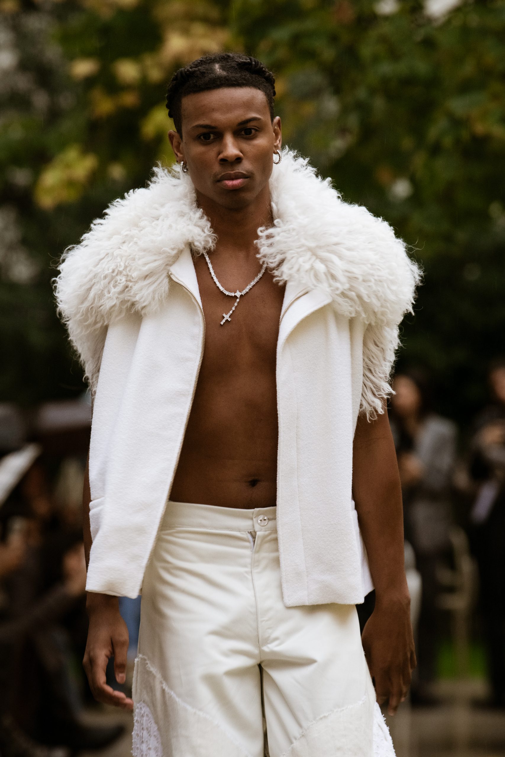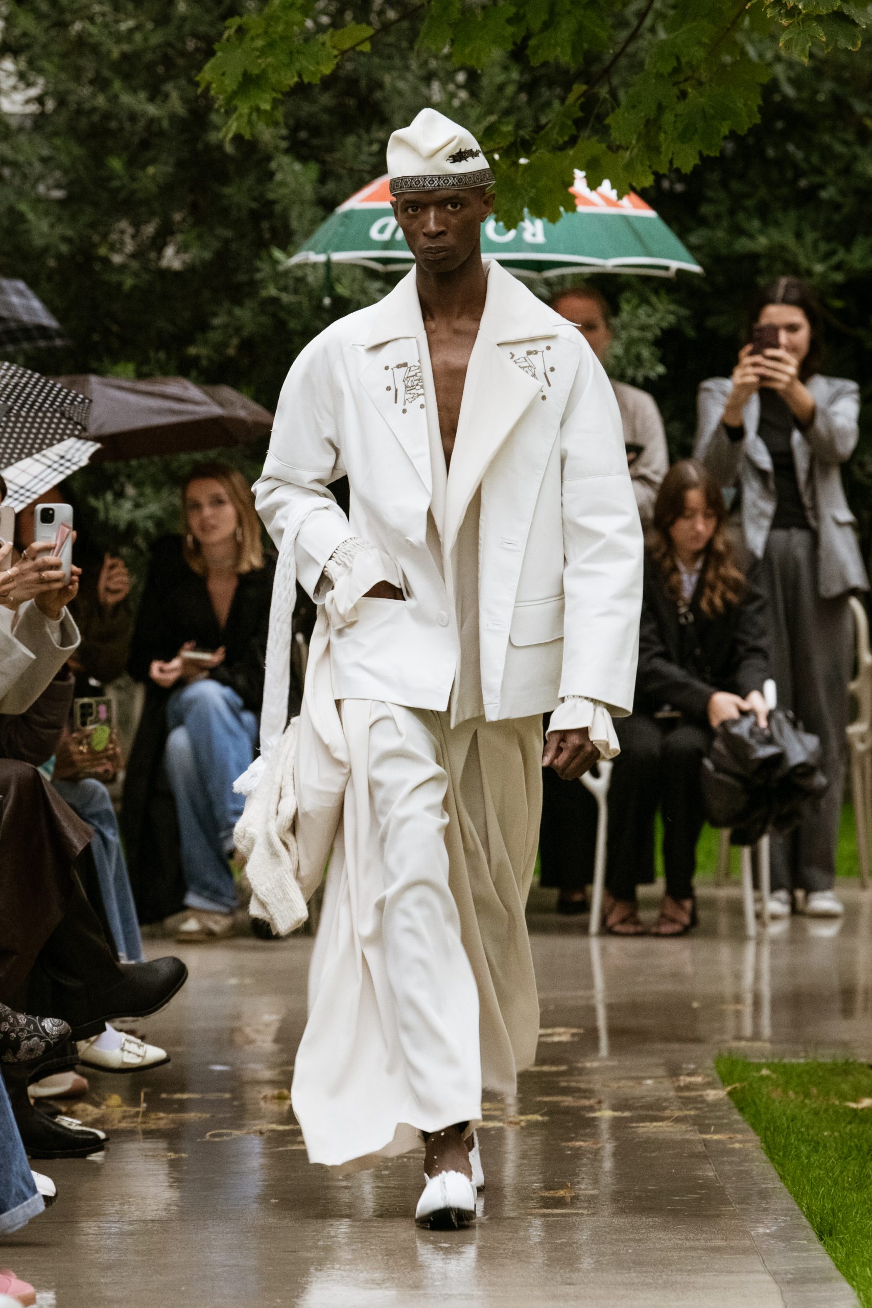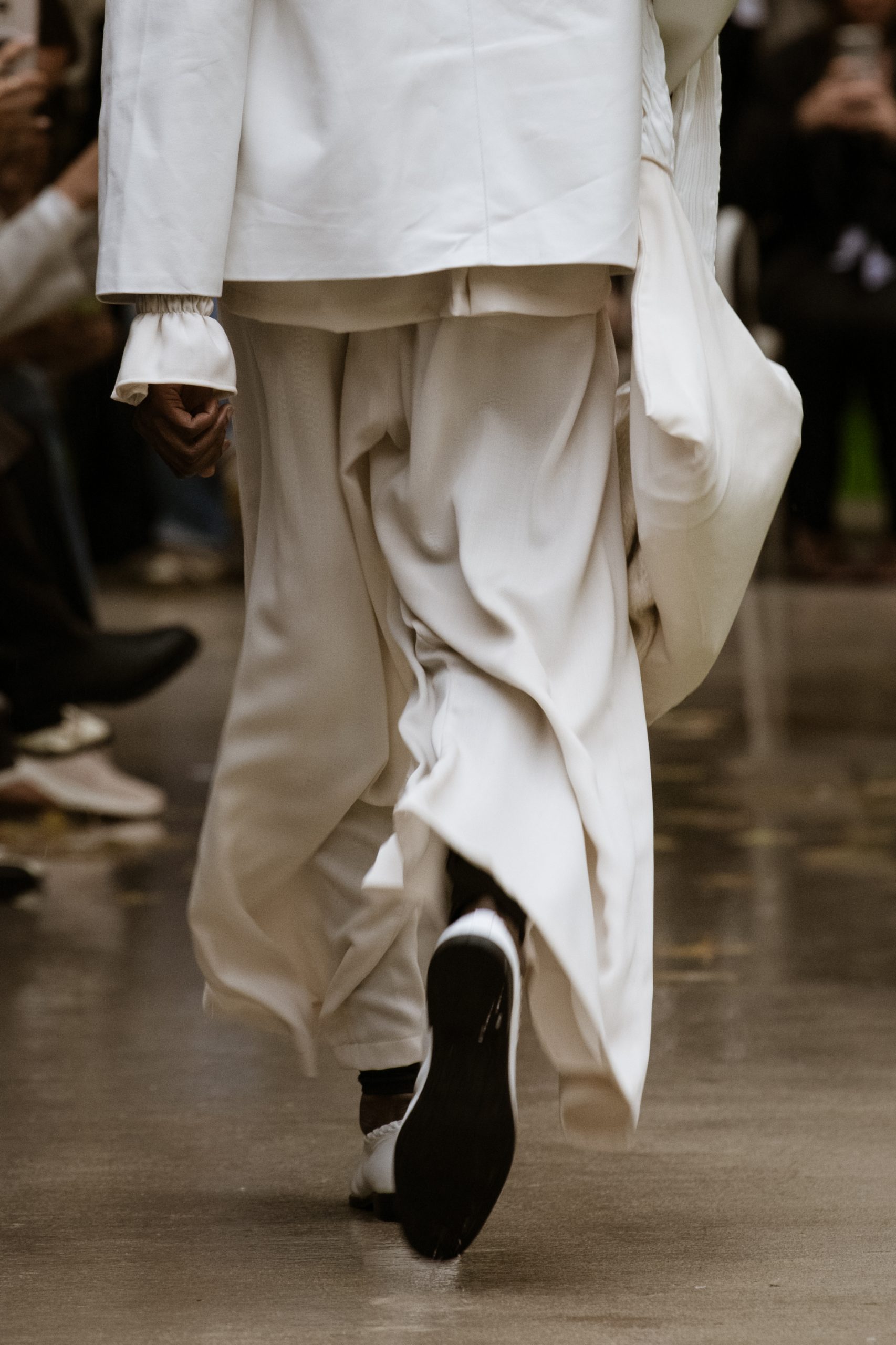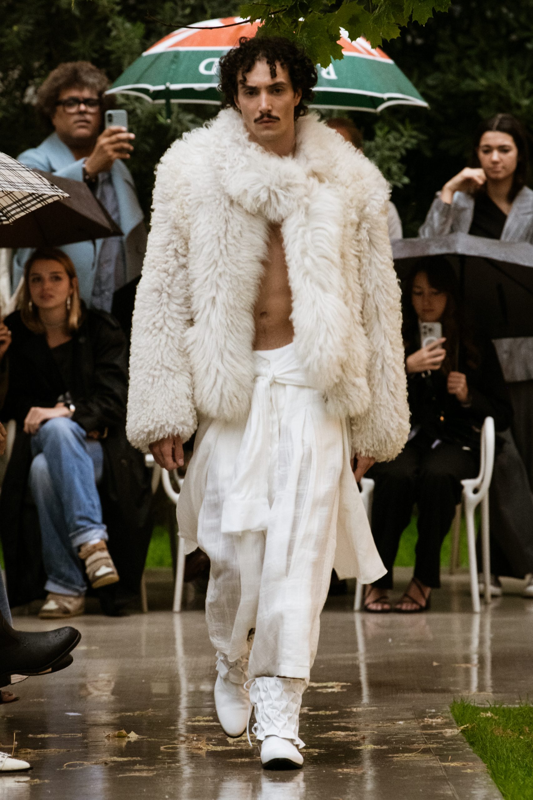 At the center of the collection lies dor, the untranslatable Romanian word for a deep, bittersweet longing. This sentiment shapes the tailoring: coats and jackets with open lapels, shirts marked by engraved details, and silhouettes that alternate between precision and looseness. Materials such as wool, linen, leather, and natural hair are handled with both restraint and disruption, creating contrasts between softness and rigidity, tradition and reinterpretation.