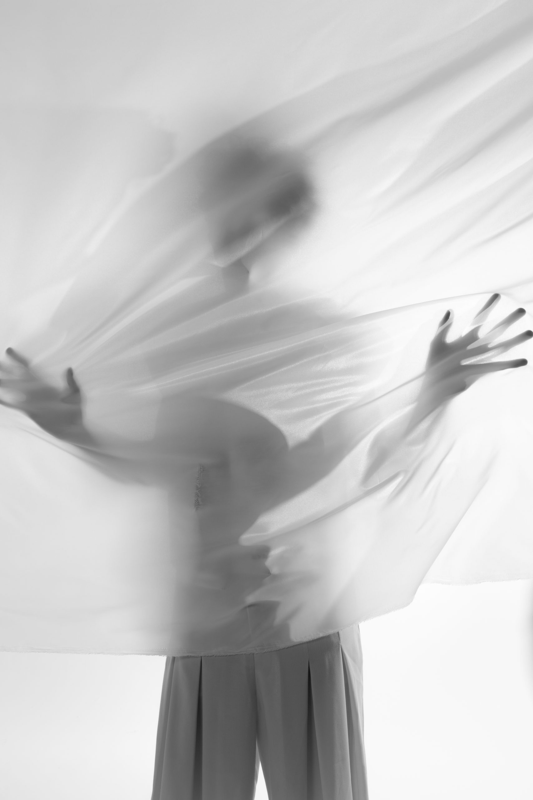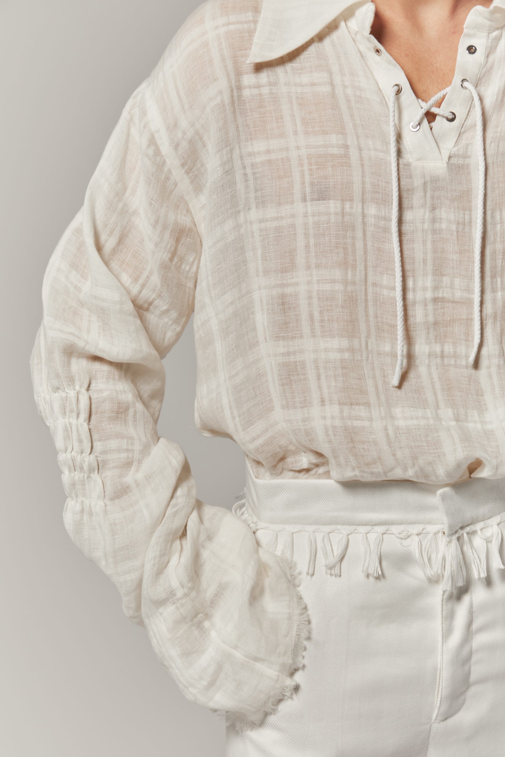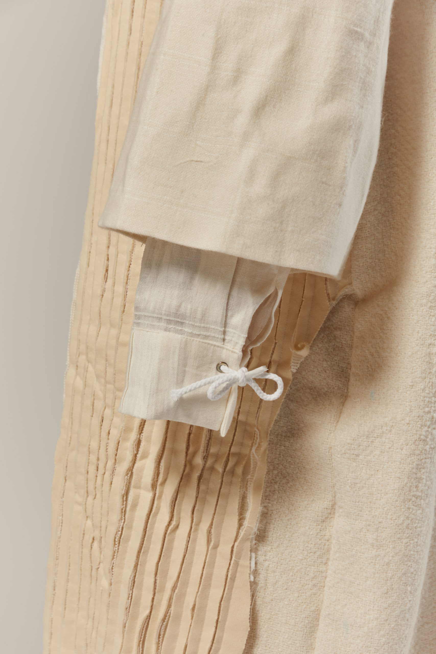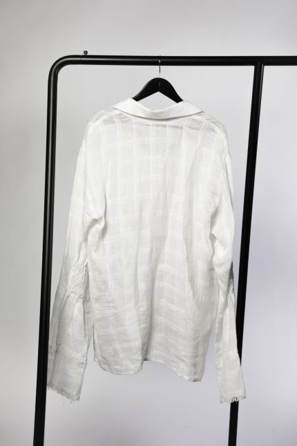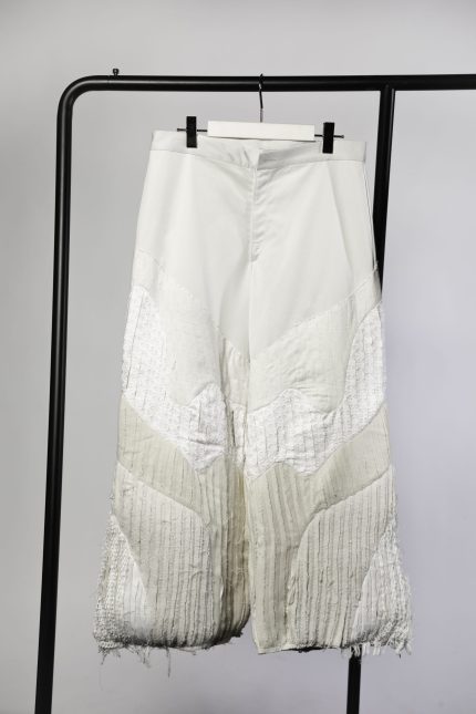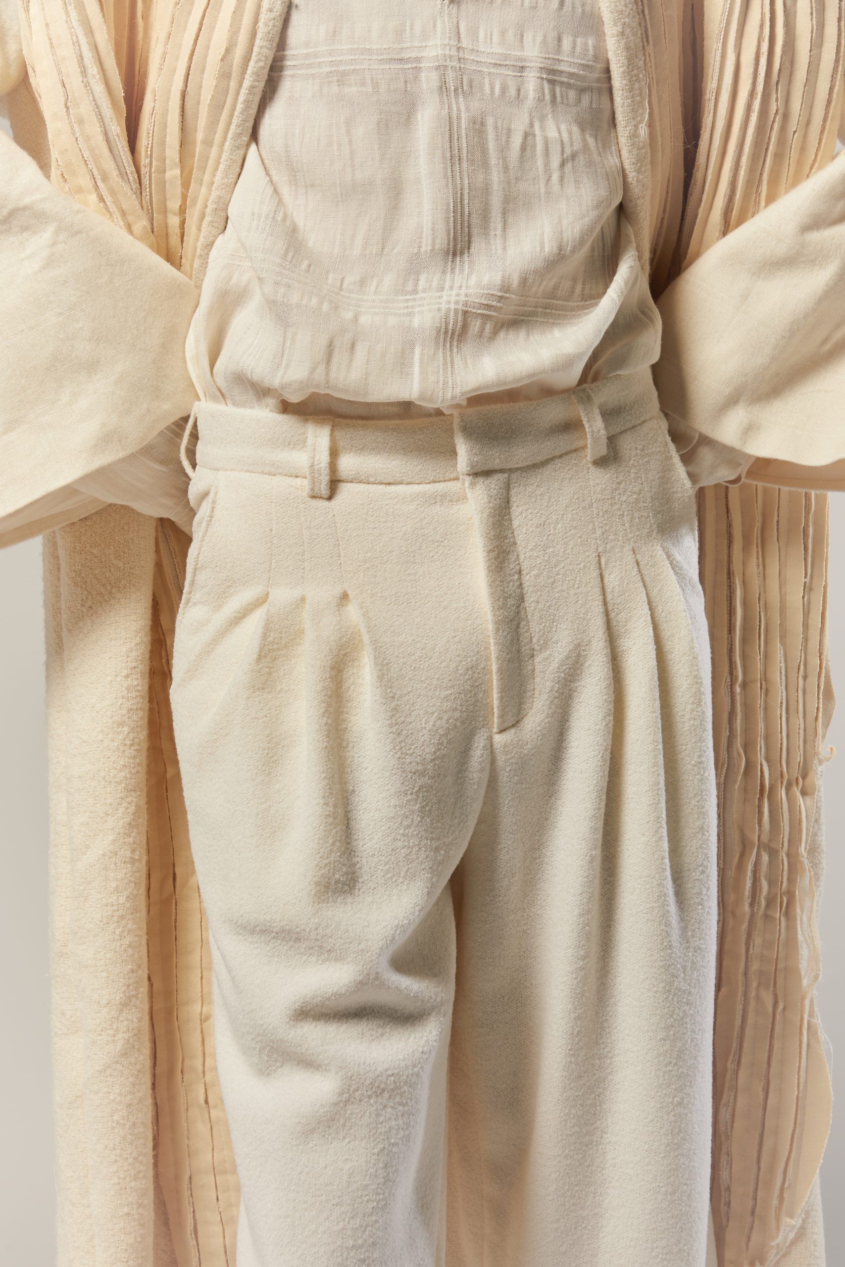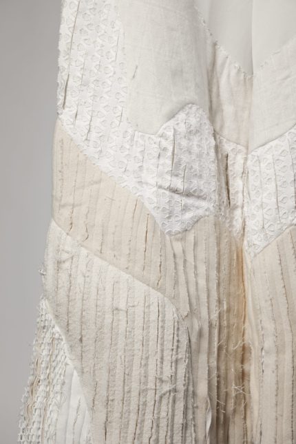 400,00 €The Doină collection draws from traditional Romanian tailoring and the free-flowing form of the doină song. Each piece explores presence through absence — seams left unfinished, threads intentionally visible, garments cut open to reveal fragility within structure.