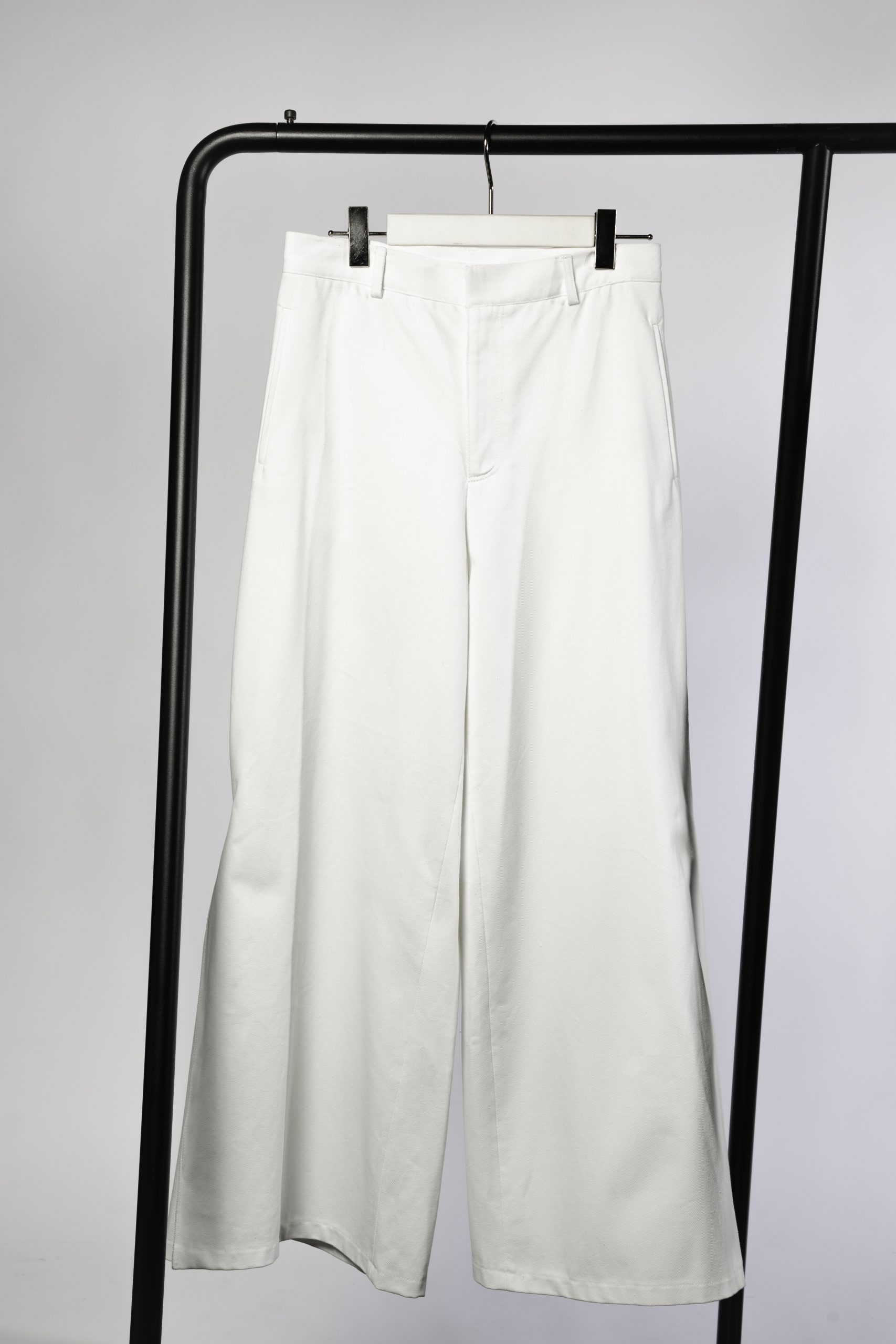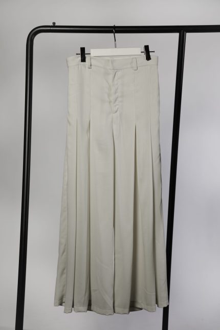 Crafted in cotton denim, the side pleats expand with movement, creating fluid lines that shift between sharp and soft. An optional wool version refines the cut, enhancing the structured form while keeping the play of folds intact.