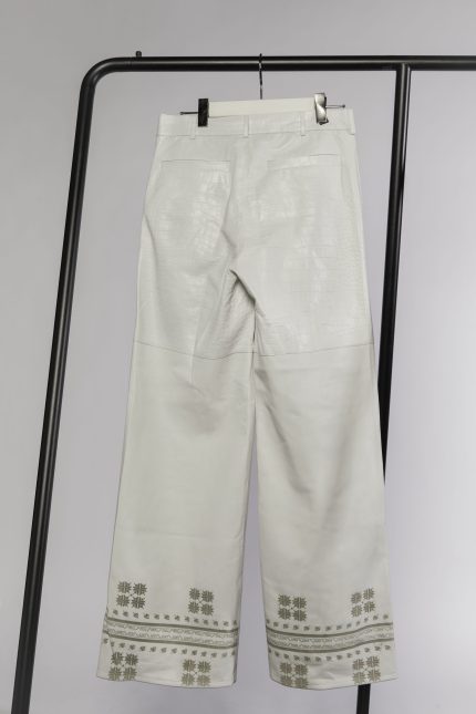 Materials are central to the process. Wool and linen are chosen for their raw tactility, while leather is engraved with motifs inspired by folk embroidery. Calfskin with natural hair finish introduces texture to sharp tailoring, and sheep hair reinterprets the shepherd’s coat into a contemporary statement.