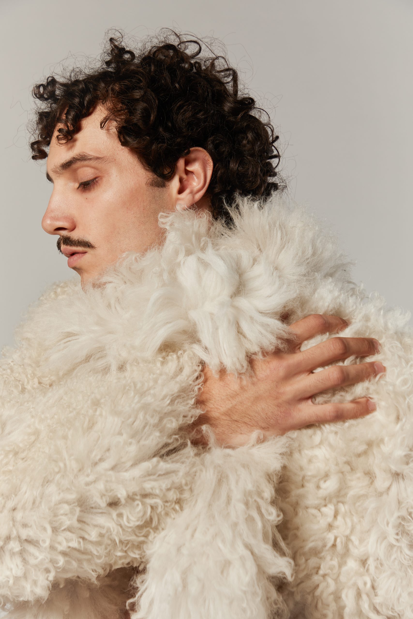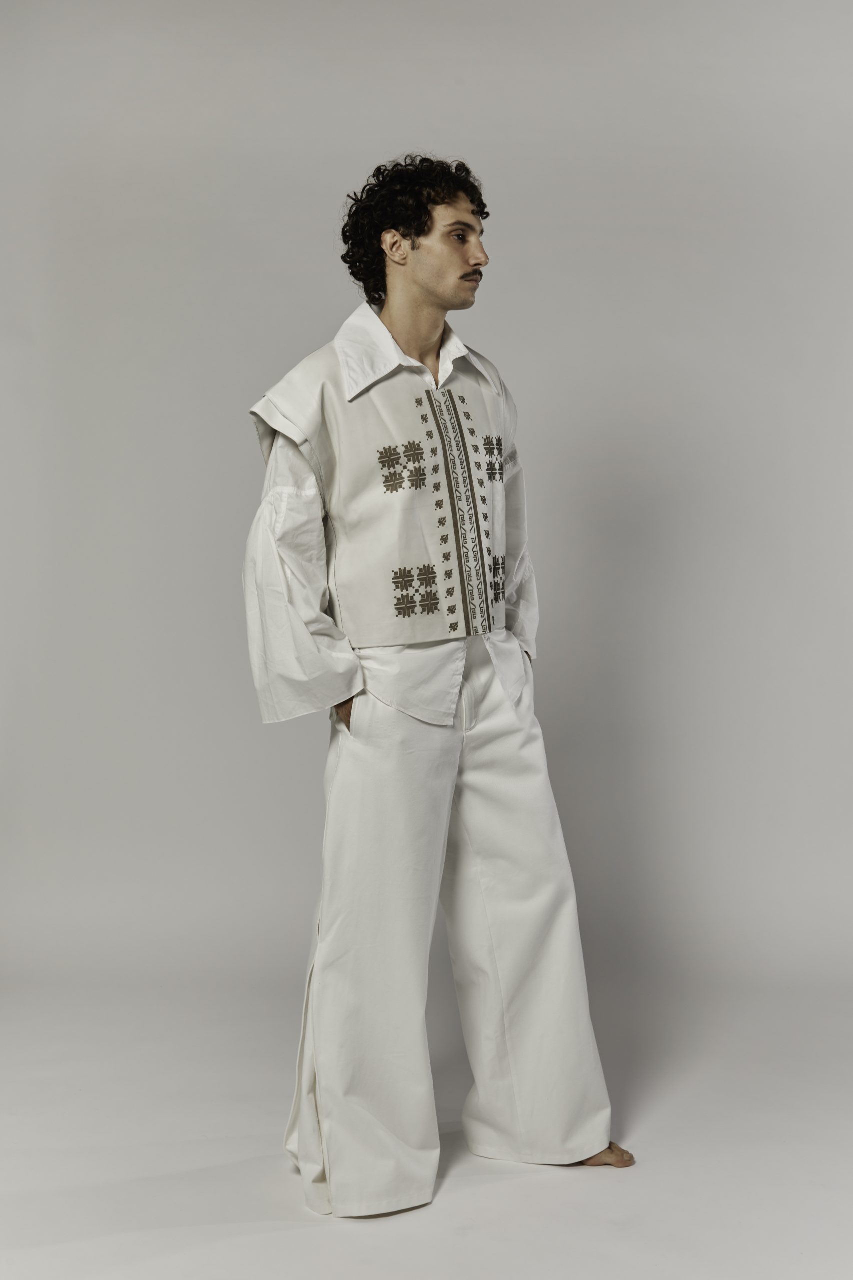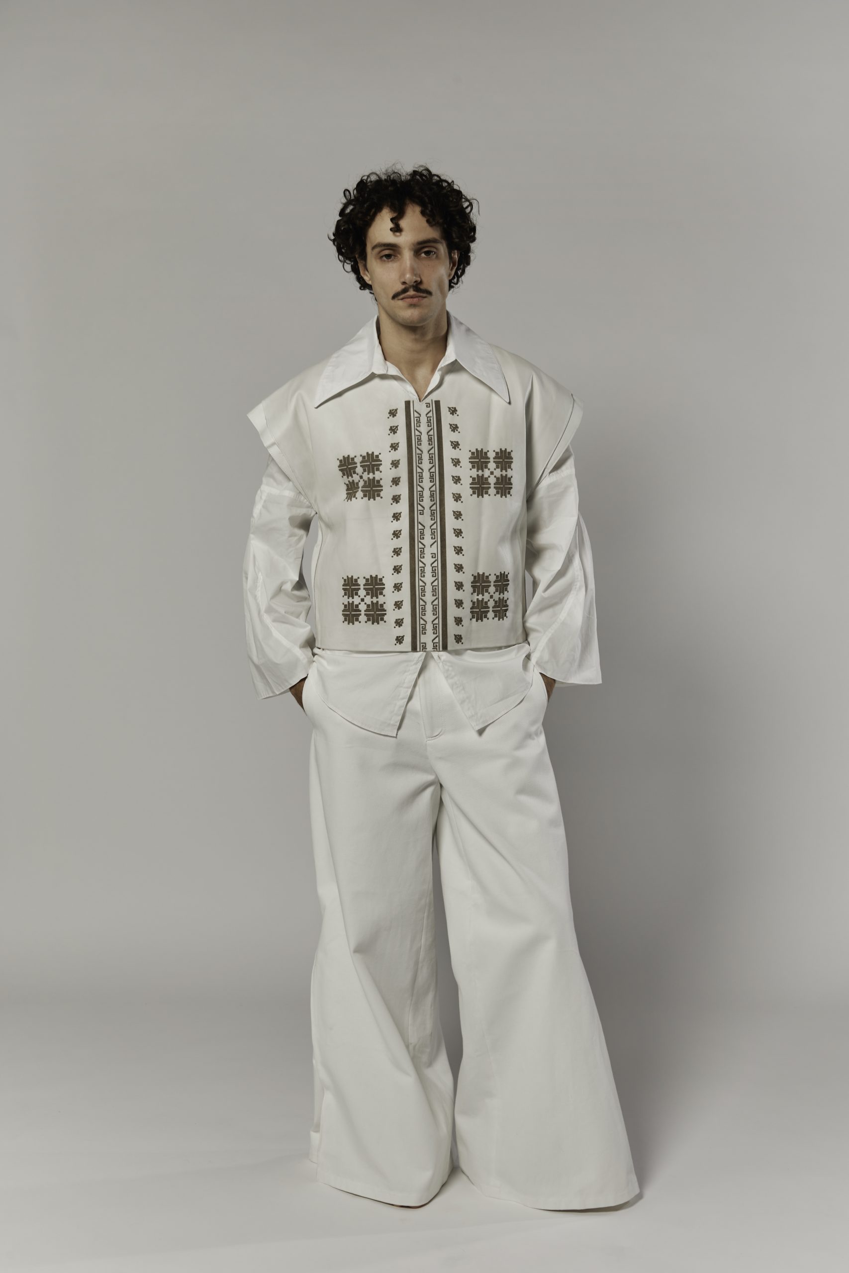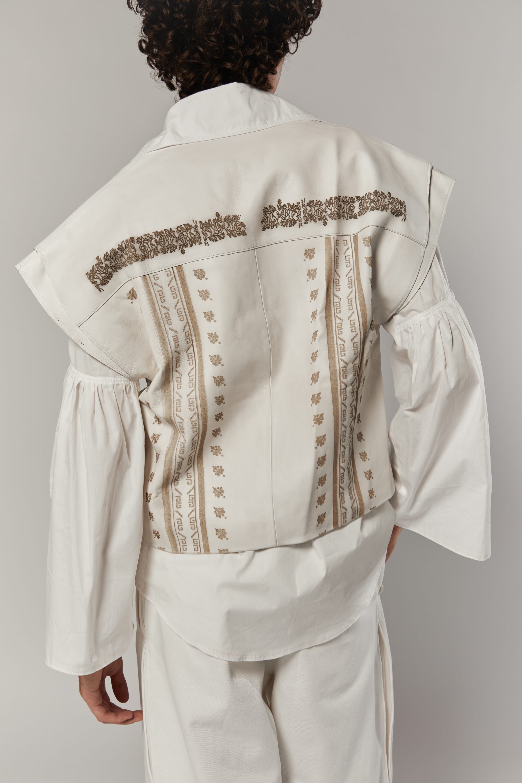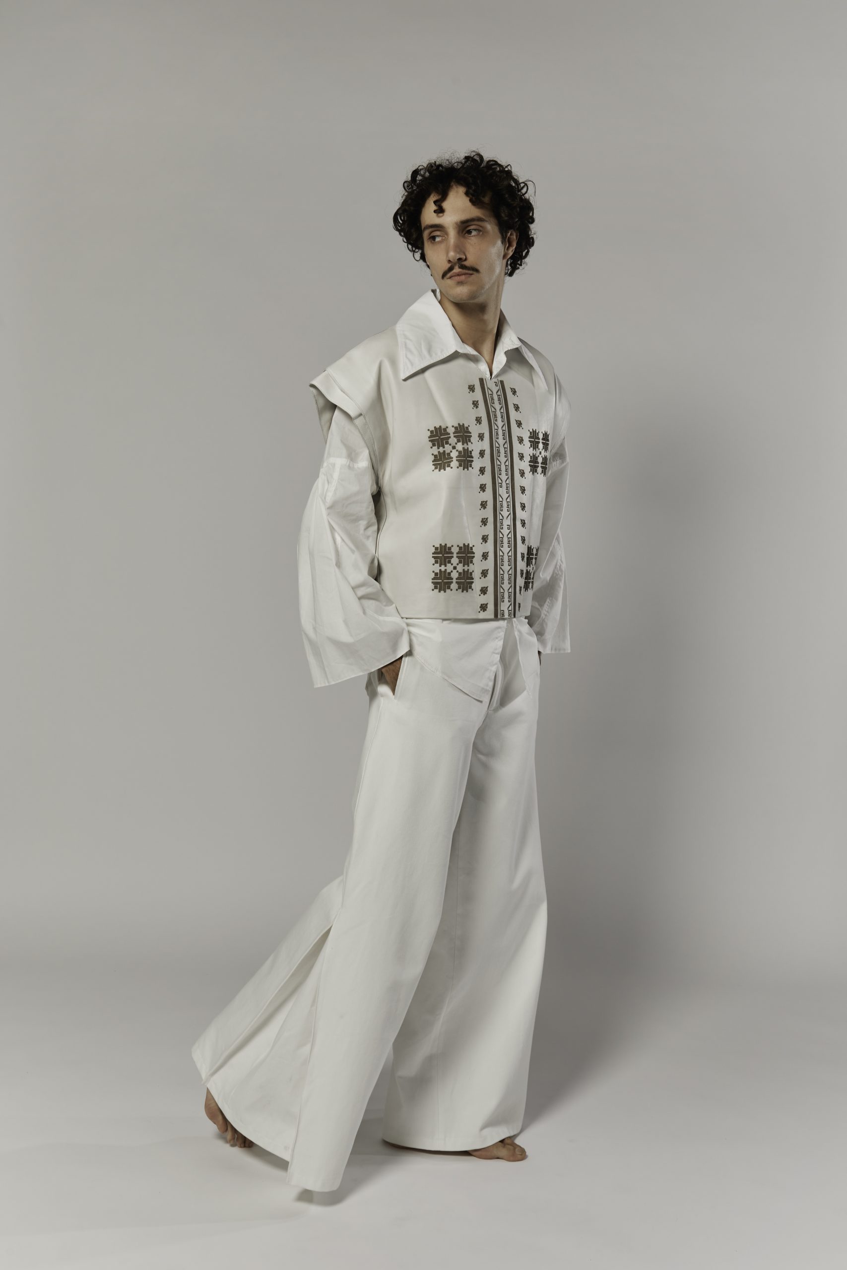 The narrative reverses the conventional codes of masculinity. While doina as a song has historically been a feminine voice, here it becomes embodied by a man who is not warrior but wanderer, lover, and healer. The garments carry this shift: cropped pony hair jackets with sharp tailoring, oversized leather shirts engraved with motifs inspired by folklore, and voluminous pieces that recall shepherd’s coats. Each design places vulnerability at the core of strength, making fragility a form of presence.
