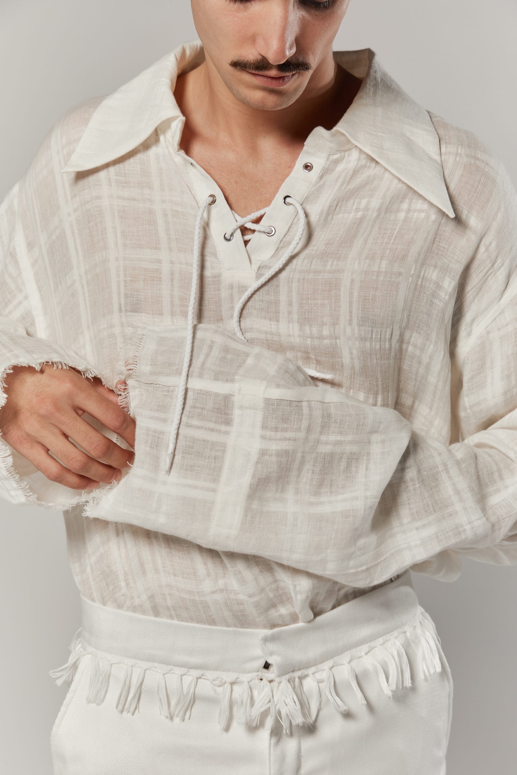 At the center of the collection lies dor, the untranslatable Romanian word for a deep, bittersweet longing. This sentiment shapes the tailoring: coats and jackets with open lapels, shirts marked by engraved details, and silhouettes that alternate between precision and looseness. Materials such as wool, linen, leather, and natural hair are handled with both restraint and disruption, creating contrasts between softness and rigidity, tradition and reinterpretation.