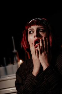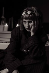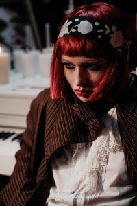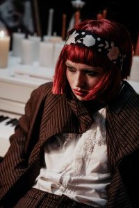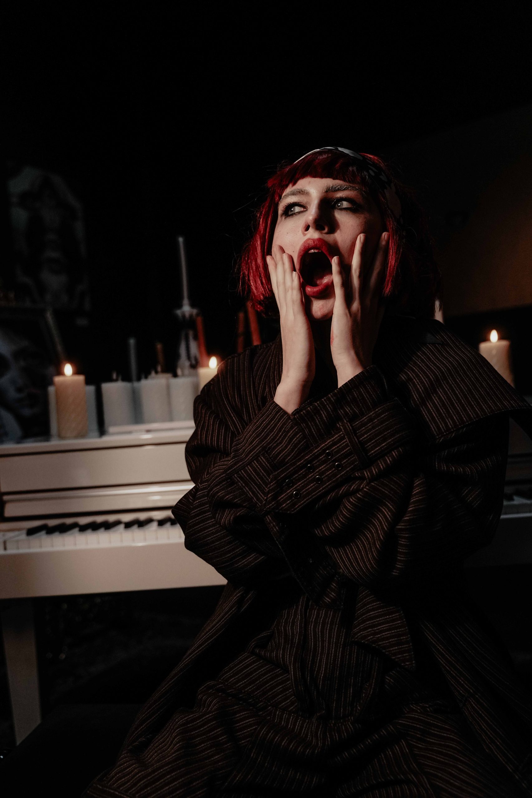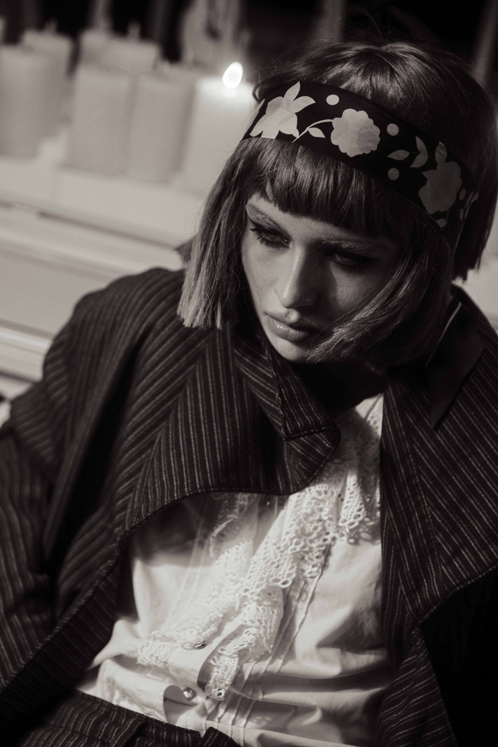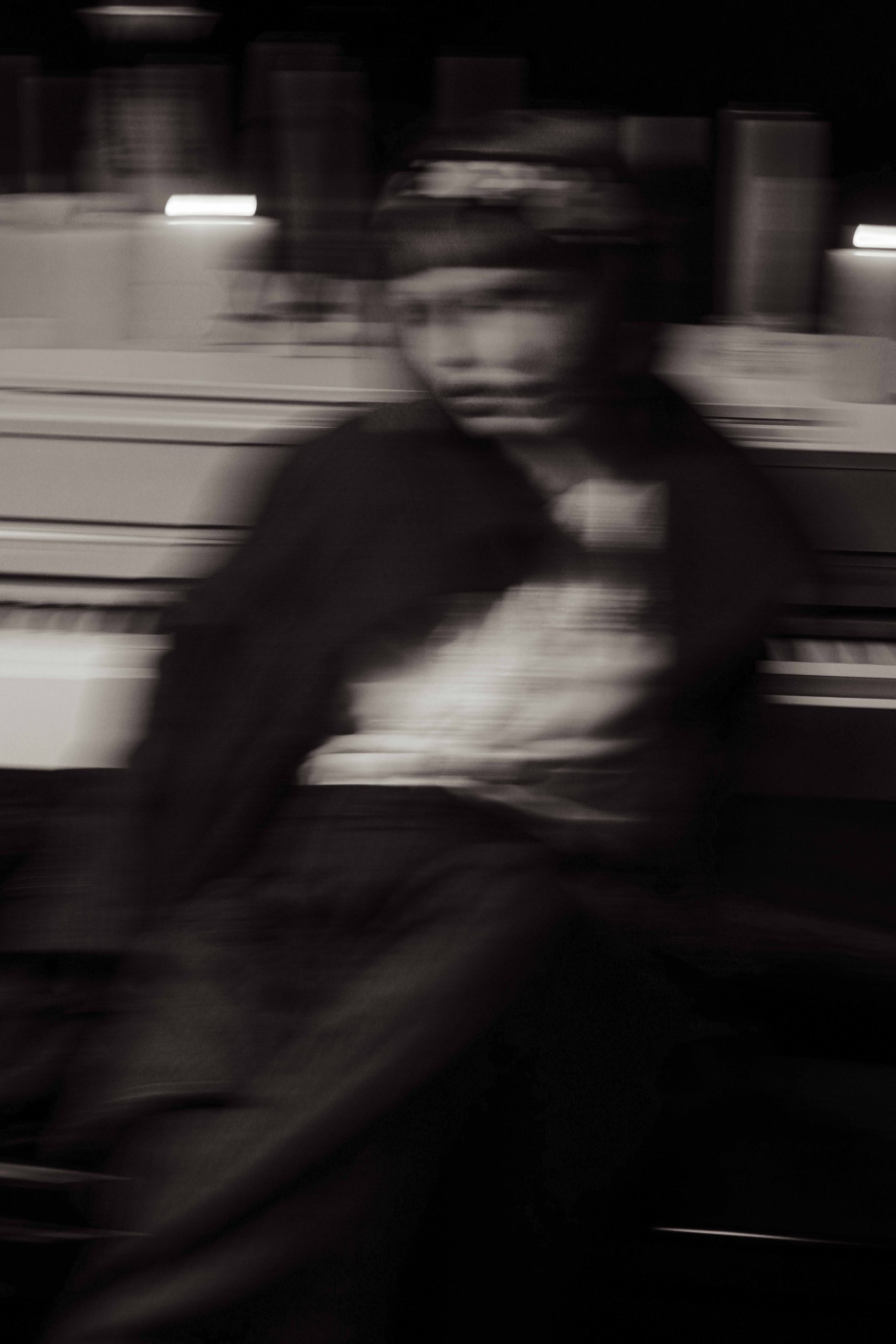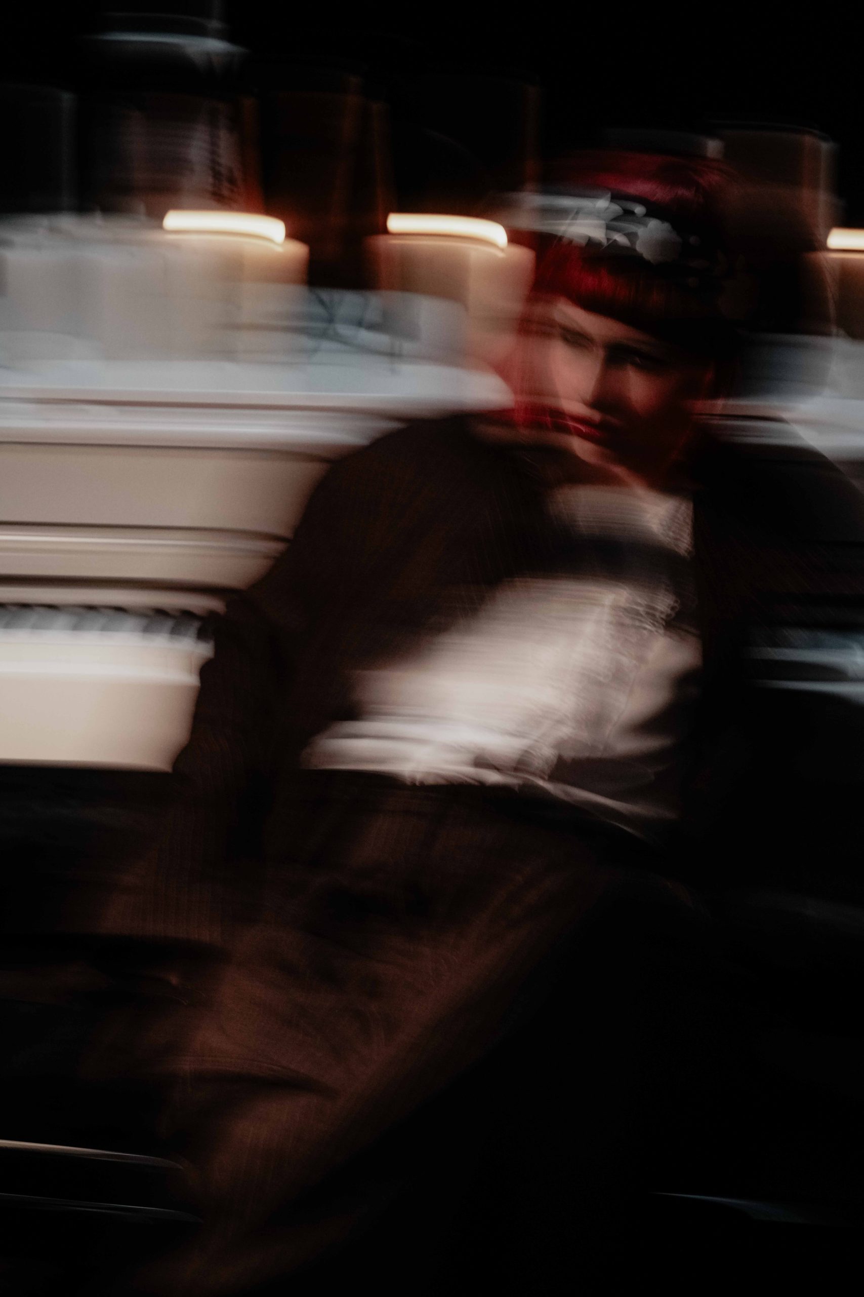 You take a step. The floor feels unsteady, like a memory slipping through your fingers. Your shirt—crisp yet undone—moves with you, details fading in and out, disappearing like thoughts at the edge of recall. The rhythm is playful, the unpredictability thrilling. Wool brushes against your skin, leather grounds you, but still, the lines blur. Are you here, now, or somewhere else?