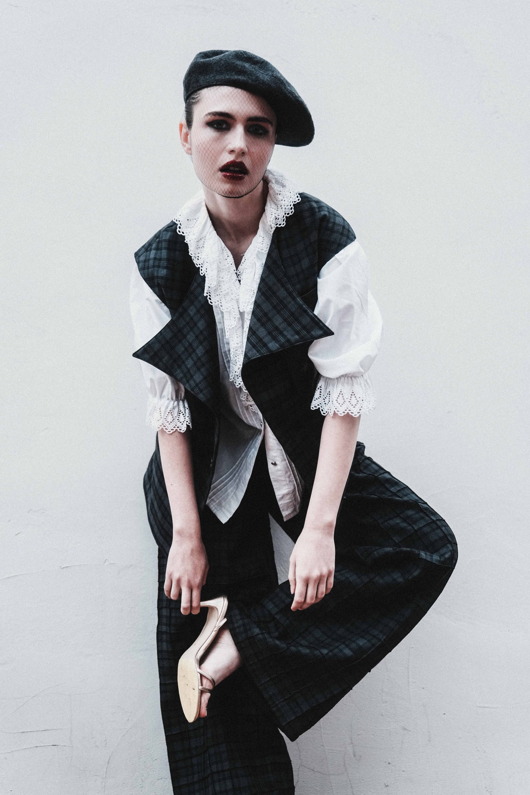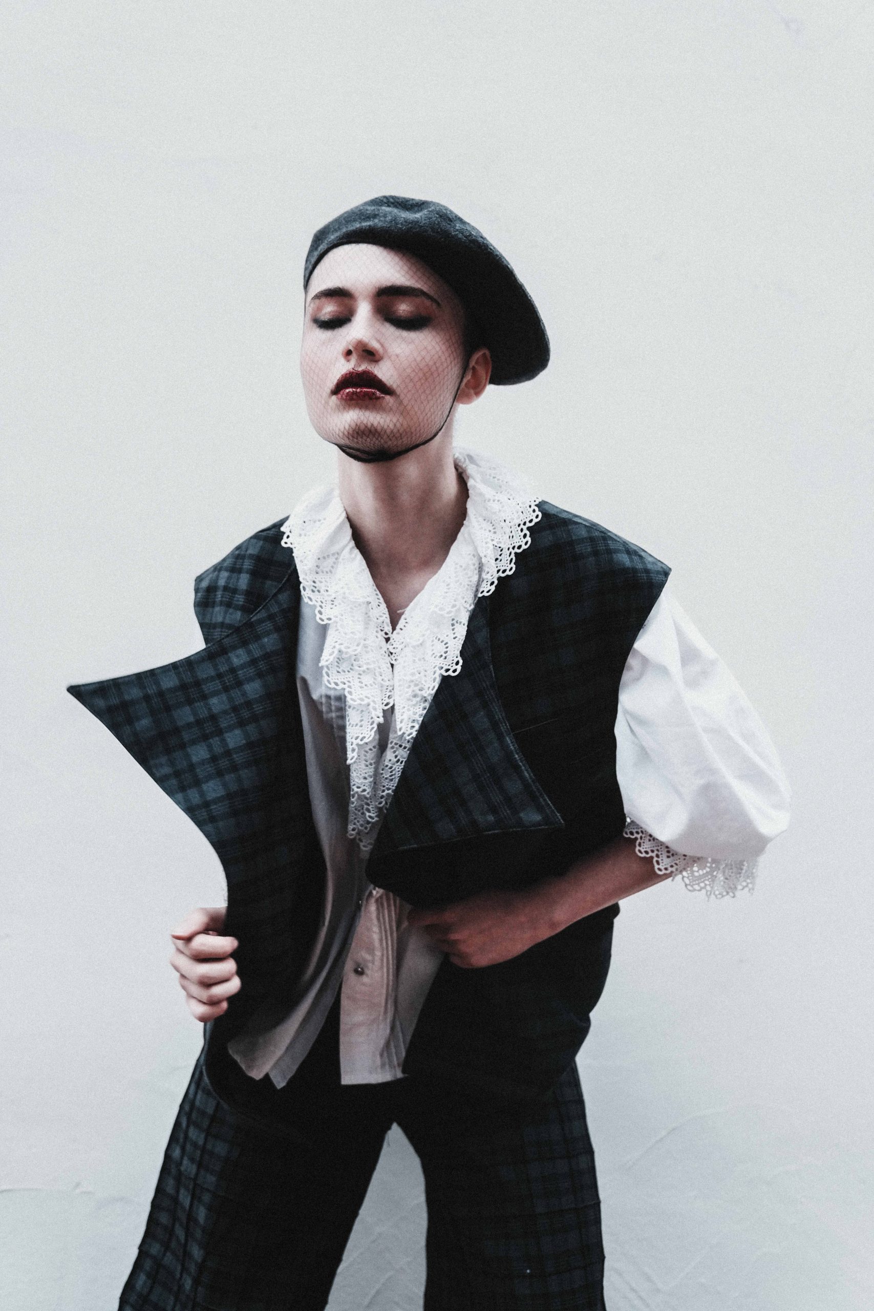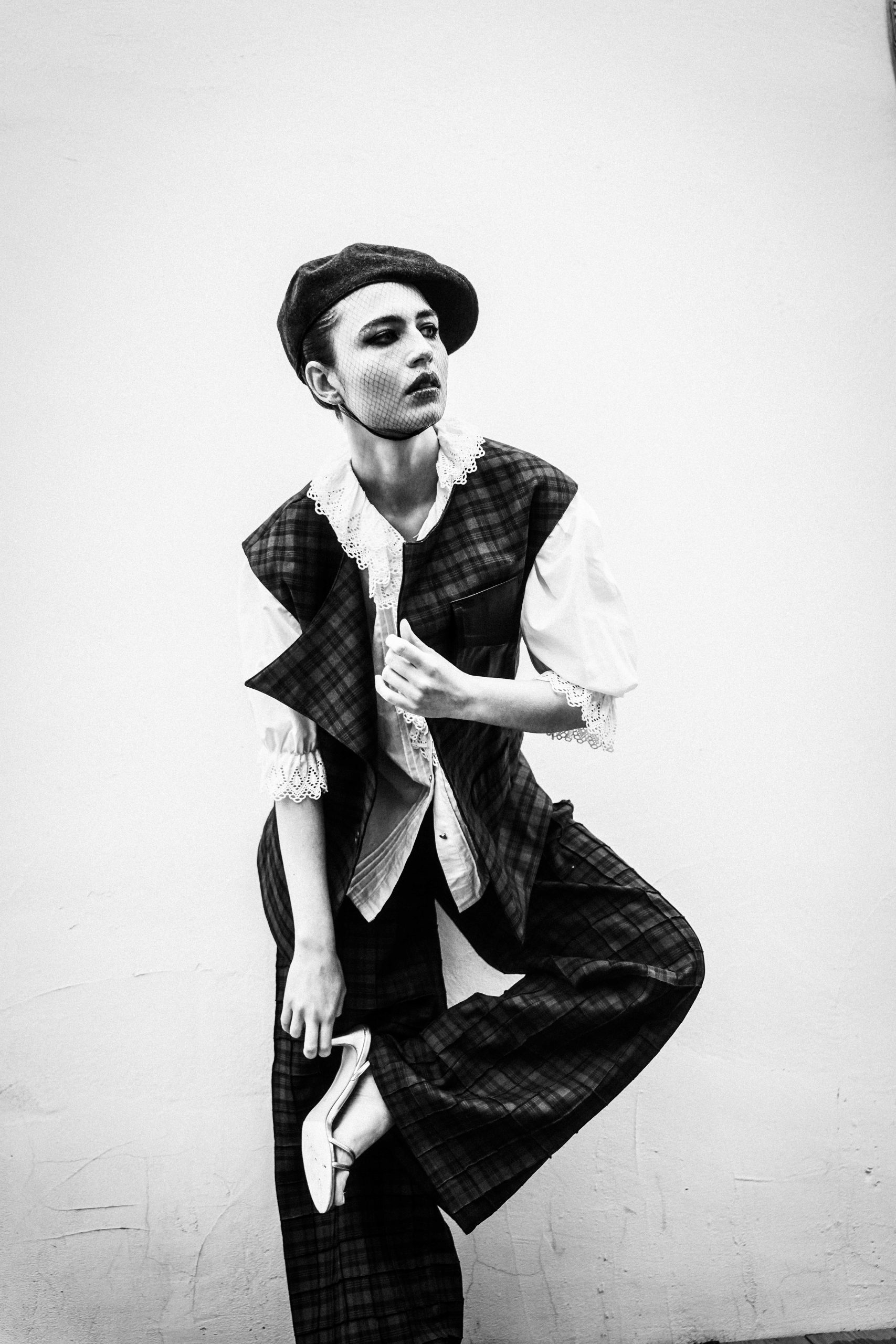 You take a step. The floor feels unsteady, like a memory slipping through your fingers. Your shirt—crisp yet undone—moves with you, details fading in and out, disappearing like thoughts at the edge of recall. The rhythm is playful, the unpredictability thrilling. Wool brushes against your skin, leather grounds you, but still, the lines blur. Are you here, now, or somewhere else?